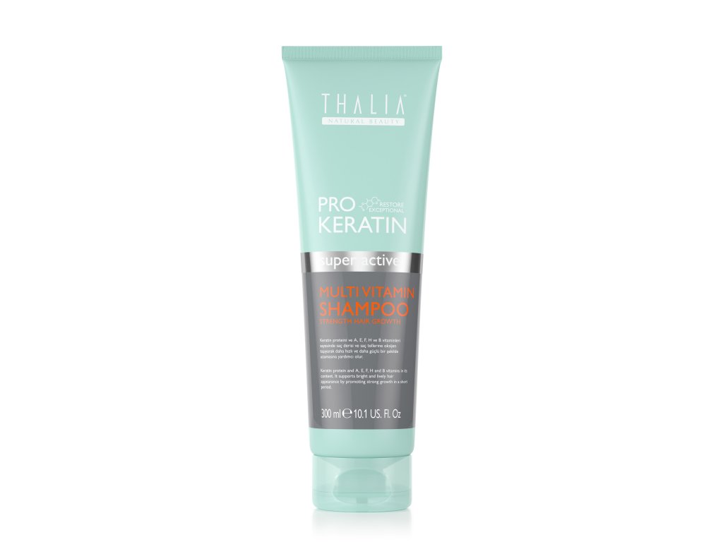 Šampon Thalia Pro Keratin Multivitamin pomáhá vlasům růst rychleji a silněji díky přenosu kyslíku keratinovými proteiny a vitamíny A, E, F, H a B. Podporuje rychlý růst a zářivý vzhled vlasů. Je vhodný pro ošetření jemných a matných vlasů.